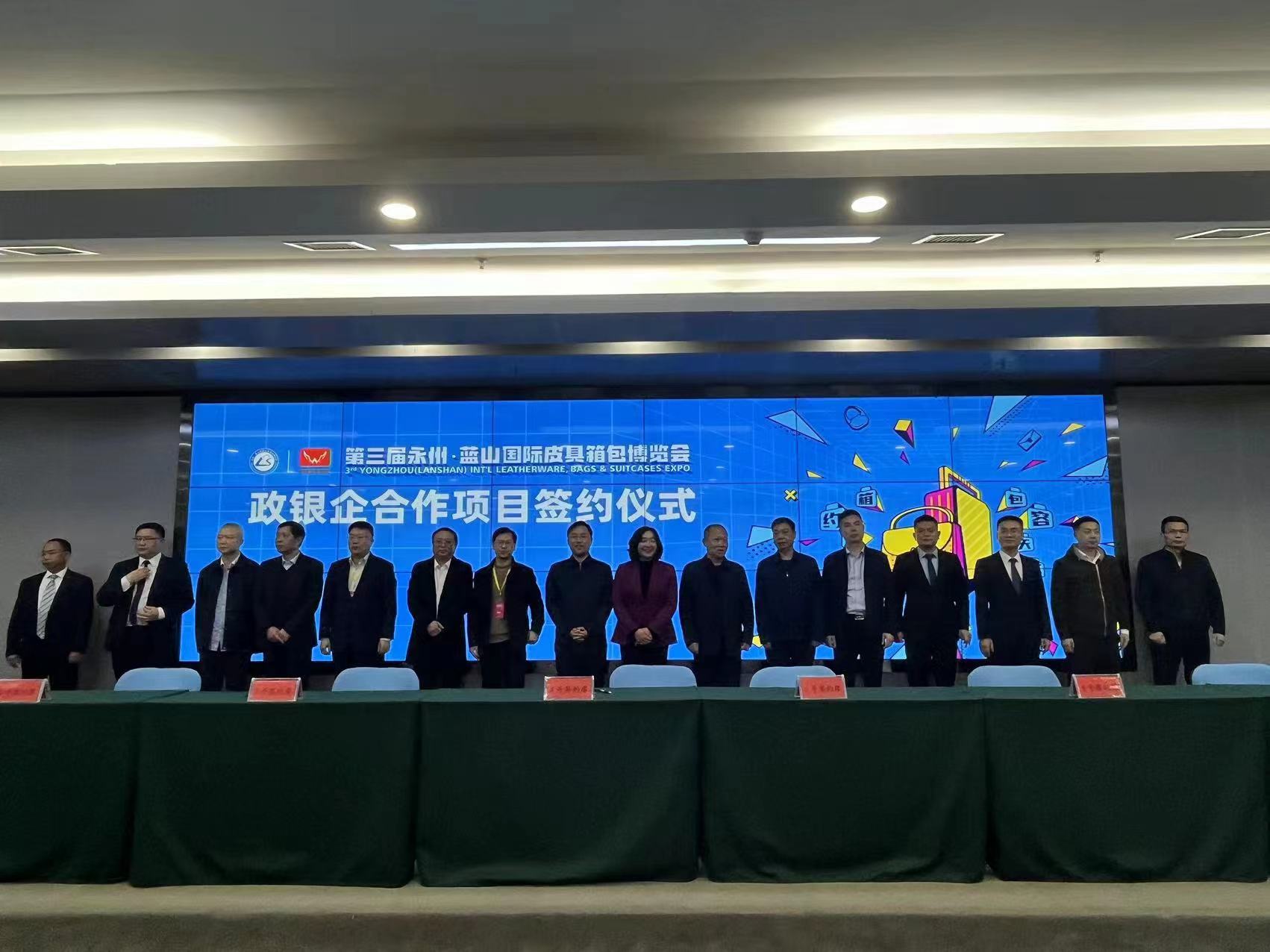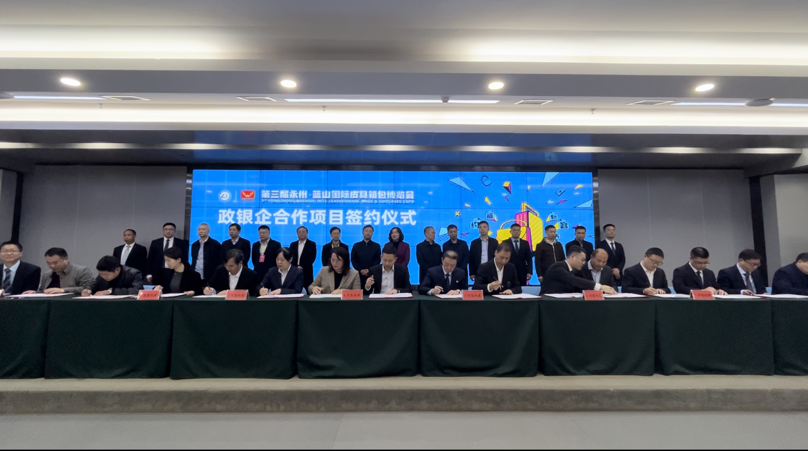 3月24日上午,第三屆永州·藍山國際皮具箱包博覽會開幕后,藍山縣舉行政銀企合作項目簽約儀式。永州市政府副秘書長肖瀟、永州市人民銀行中心支行行長王一凡、永州市銀保監(jiān)分局二級調(diào)研員李樹屏、永州市優(yōu)化辦主任文貽榮、永州市各銀行機構(gòu)主要負責人以及藍山縣委副書記、縣長鄧群,縣委常委、常務(wù)副縣長張國材,副縣長劉建軍等領(lǐng)導(dǎo)參加了儀式。